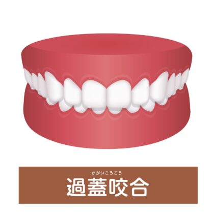 過蓋咬合とは、下の前歯に上の前歯が深くかぶさり、下の前歯がほとんど見えなくなるほど噛み合わせが深い状態をいいます。