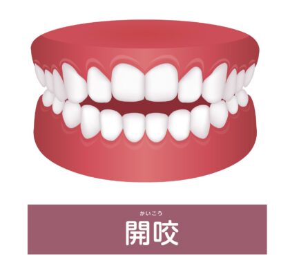 開咬とは、奥歯を噛み合わせても上下の前歯が接触せず、前方に空間ができてしまう状態をいいます。場合によっては、奥歯以外の歯が噛み合わず、部分的に隙間が生じることもあります。