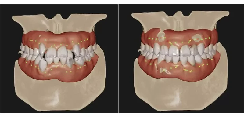 当院が導入する光学式3Dスキャナー「iTero(アイテロ)」は、AIがスキャンデータを瞬時に解析し、矯正後の歯並びをリアルタイムでシミュレーション表示します。AIが歯の動きや治療計画を緻密に設計します。これにより、患者様は治療の具体的な仕上がりをその場でイメージでき、不安を軽減しながら治療を進められます。